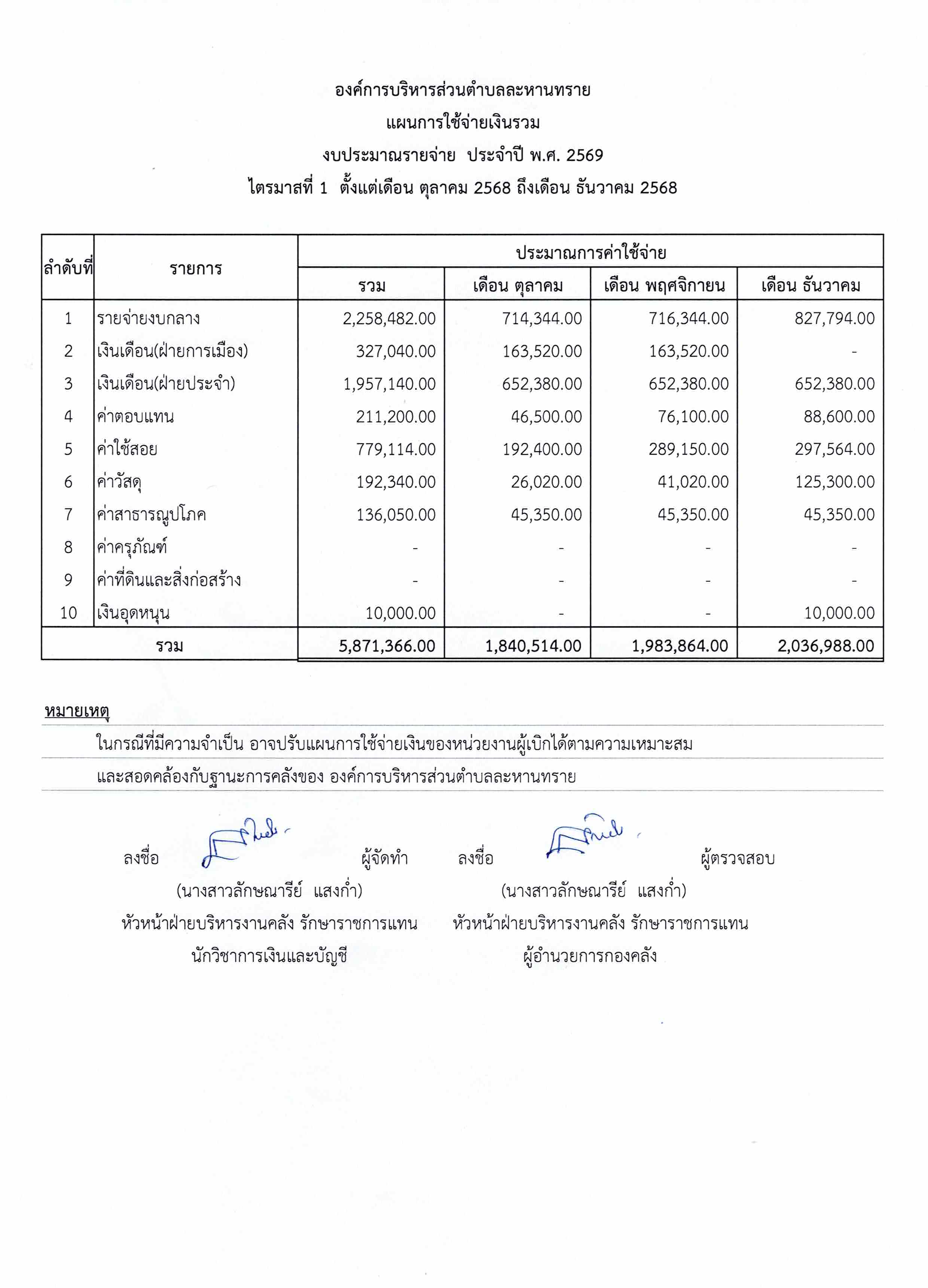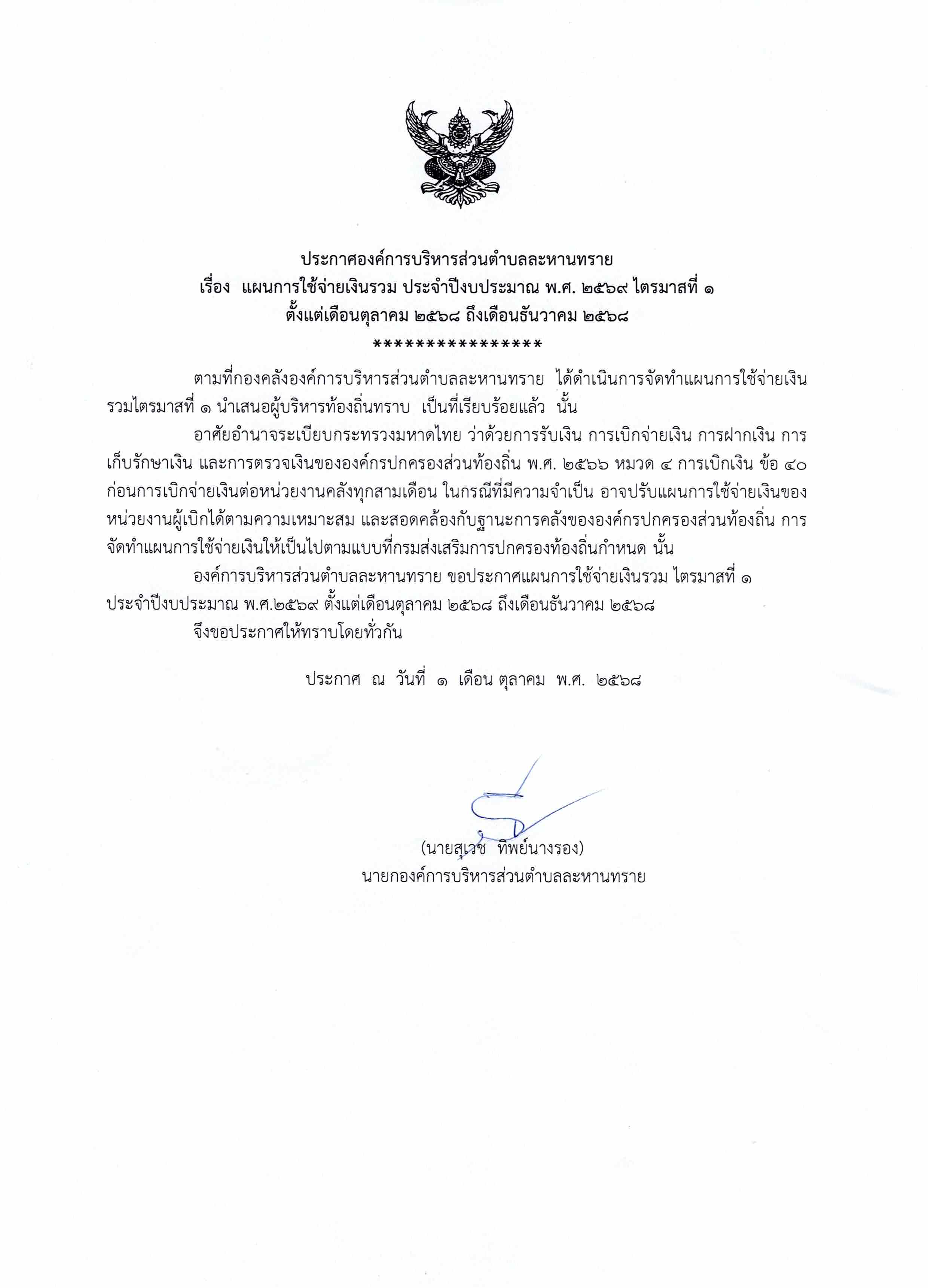 ประกาศองค์การบริหารส่วนตำบลละหานทรายเรื่องแผนการใช้จ่ายเงินรวม ประจำปีงบประมาณ พ.ศ.2569 ไตรมาสที่1 ตั้งแต่งเดือนตุลาคม 2568 ถึงเดือนธันวาคม 2568